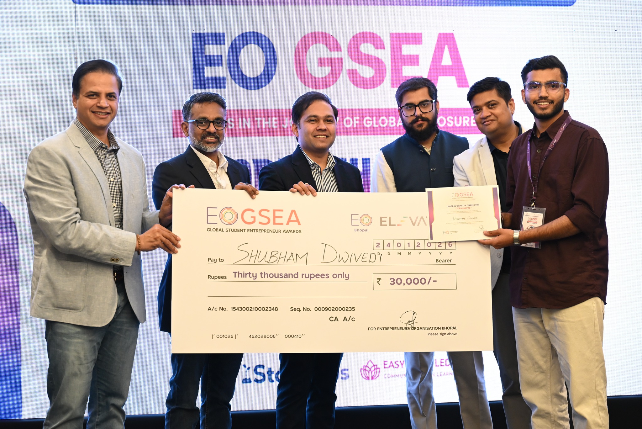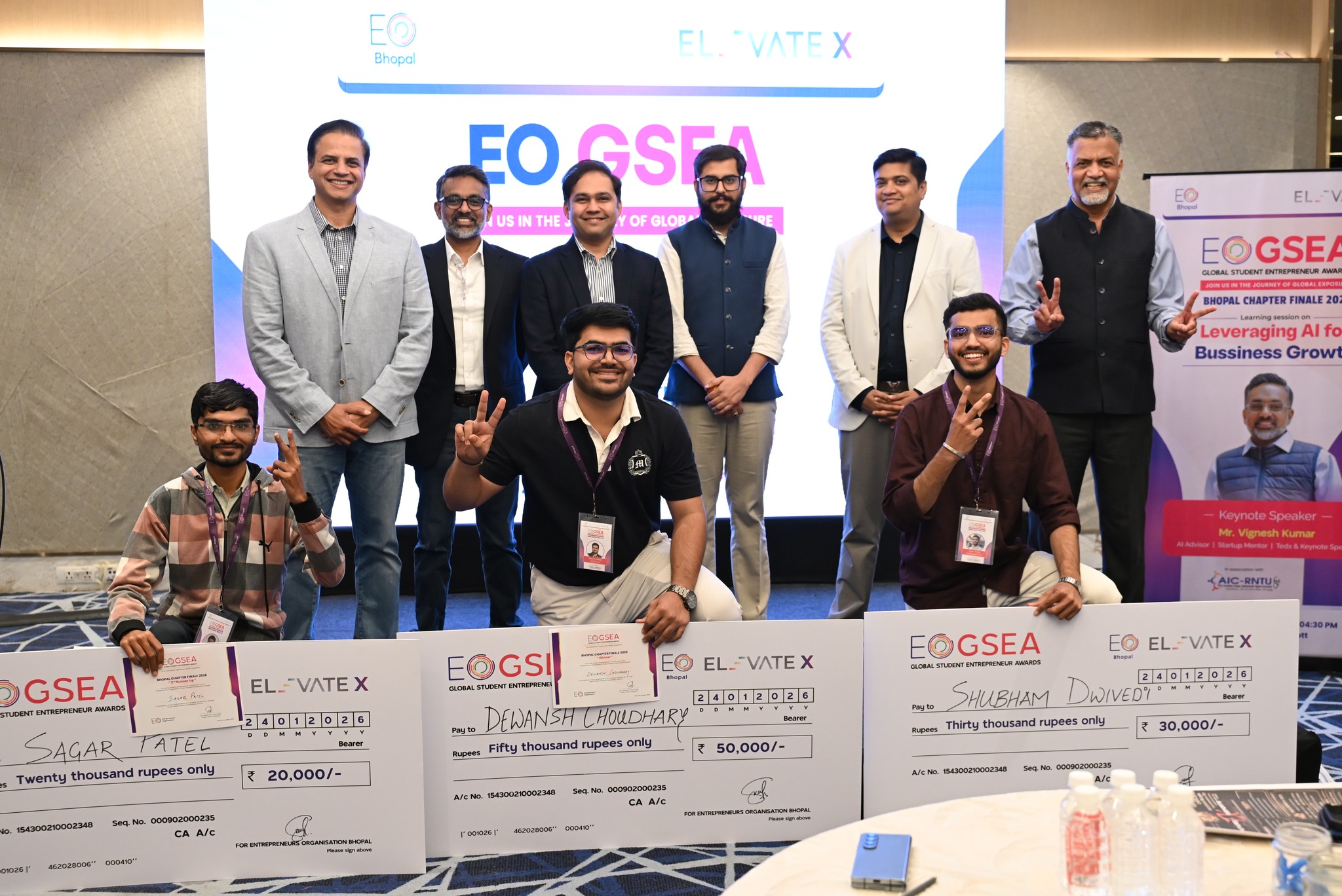 EO-GSEA Bhopal in association with AIC-RNTU successfully conducted the finale of EO GSEA Bhopal Chapter. Finale Mr. Siddharth Chaturvedi - Chairperson GSEA,Bhopal welcomed all the jury members, participants and walked everyone through the initiative by EO and journey of this year\\\'s competition. \\r\\n8 finalists competed neck to neck in the regional finale out of which the following are the winners of EO GSEA Bhopal Chapter 2025-2026 -\\r\\n1.Winner - Dewansh Choudhary (Phosic India)\\r\\n2. 1st Runner UP - Shubham Dwivedi (Frayit)\\r\\n3. 2nd Runner UP - Sagar Patel (Newway Biotech)\\r\\n\\r\\nThe learning session on “Leveraging AI for Business Growth” was delivered by keynote speaker Mr. Vignesh Kumar, AI Advisor and Startup Mentor. The session focused on how entrepreneurs and startups can strategically adopt A