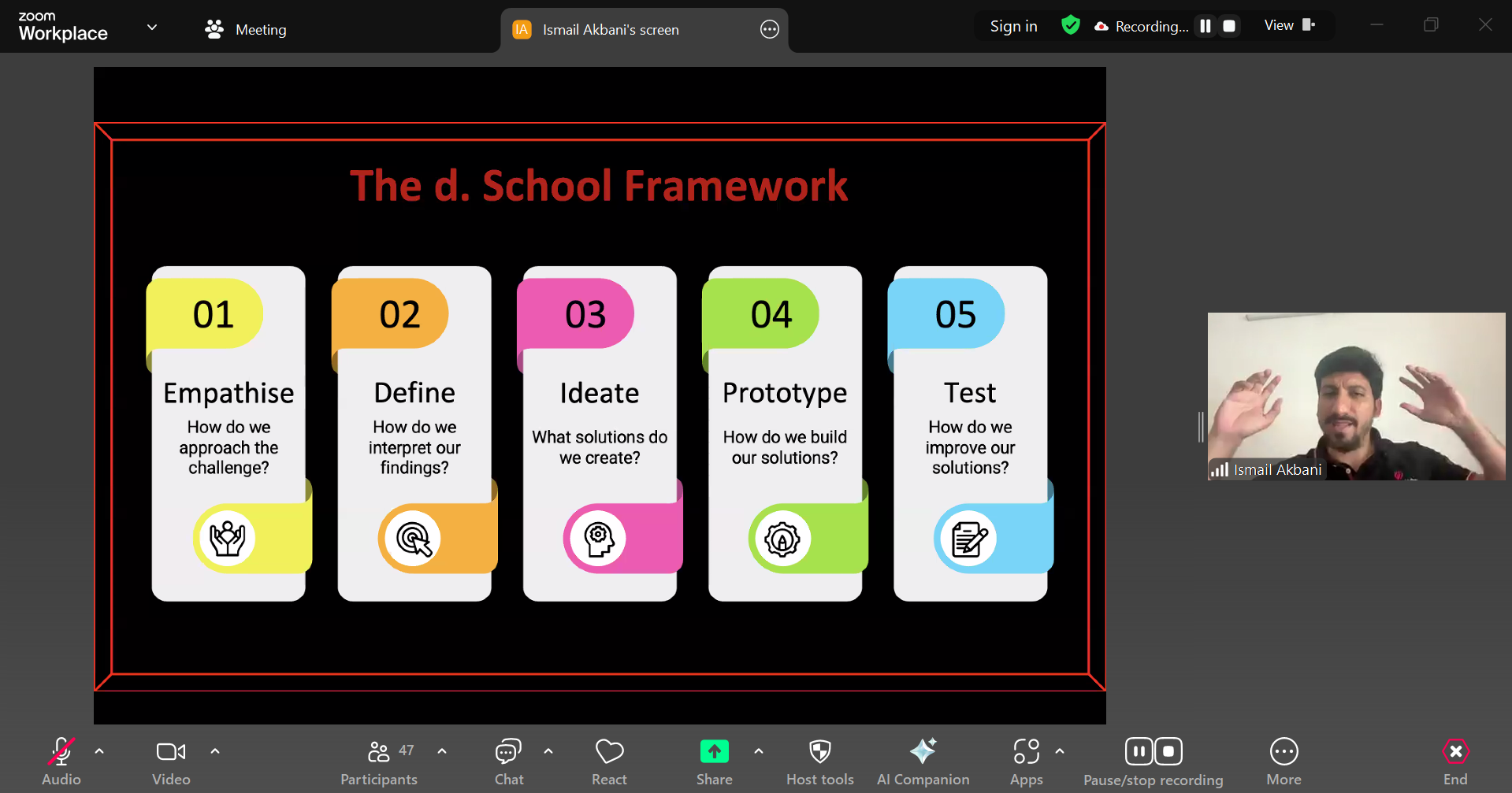 Objectives in Brief: The session aimed at providing participants knowledge about user-centric innovation through the core stages of design thinking, fostering creative confidence and problem-solving through hands-on activities and collaboration.